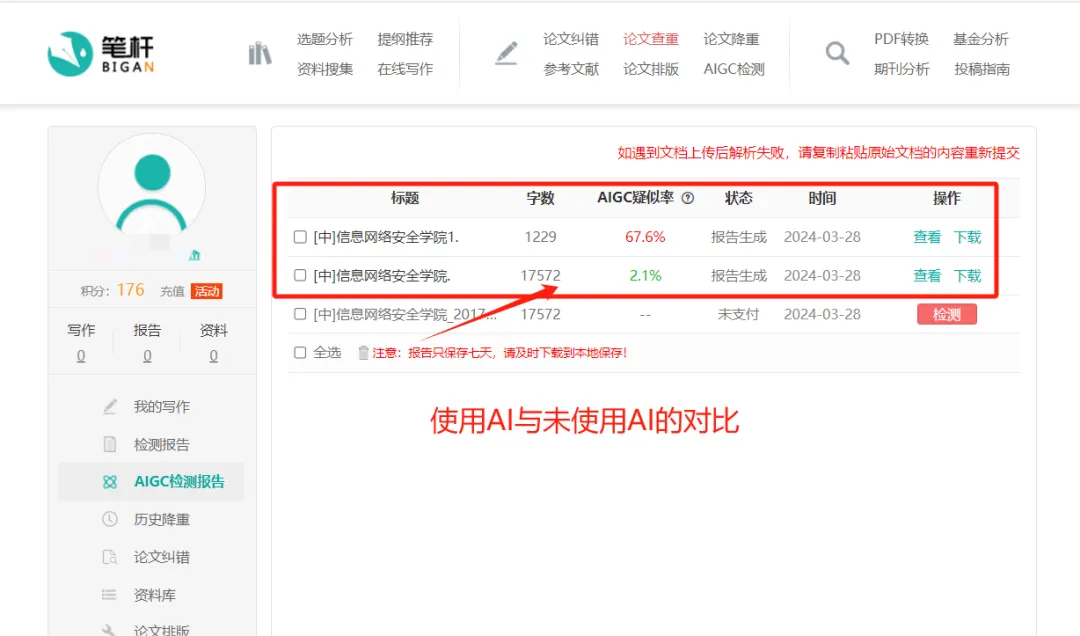 提交检测后,需等待1-3分钟,即可在个人中心中查看相关信息,报告生成后仅保存七天,需及时下载到本地。