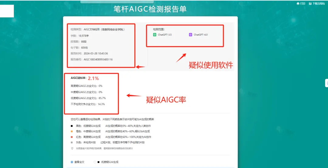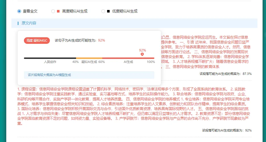 AIGC(Artificial Intelligence Generated Content)检测是一种最新的检测方式,它可以判断文论是否由AI技术生成。检测结果与论文质量无关,仅表示文本中存在AI生成可能性的概率。